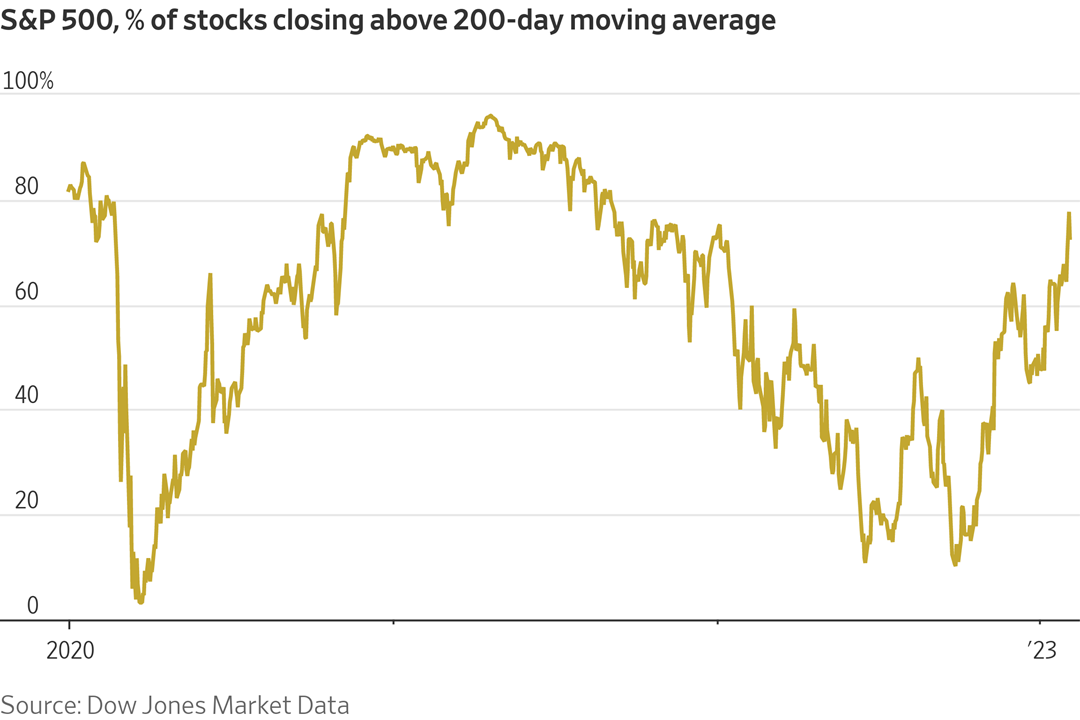 From what I assume from above to be the October lows of 2022 where under 20% were trading above their 200-day, that number is now approaching 80%.