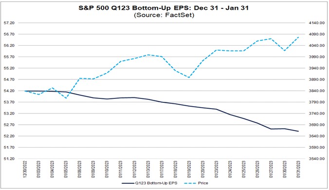 The market and earnings are diverging. Earnings historically drive prices but that has not been the case to start 2023. While the market has rallied, Q1 EPS estimates for the S&P 500 were reduced by over 3% which is very atypical. Many will argue forward EPS estimates have further to fall and that is not currently being priced in. What is being priced in are rate cuts in the latter half of 2023 🤔?