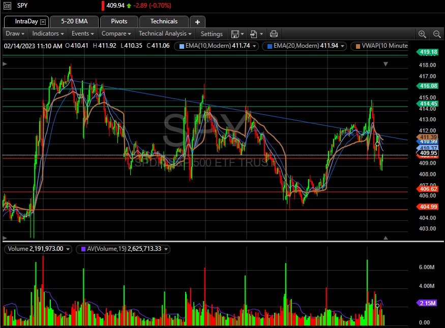 I am still watching the 410 level on SPY. I have put that at the top of the trading range for quite some time and we are loitering there as we speak. If it can’t find support here next stop is likely 405.