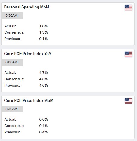Core PCE Price Index YoY was 4.7%, also ahead of both the 4.3% consensus and previous month’s 4.6%.
