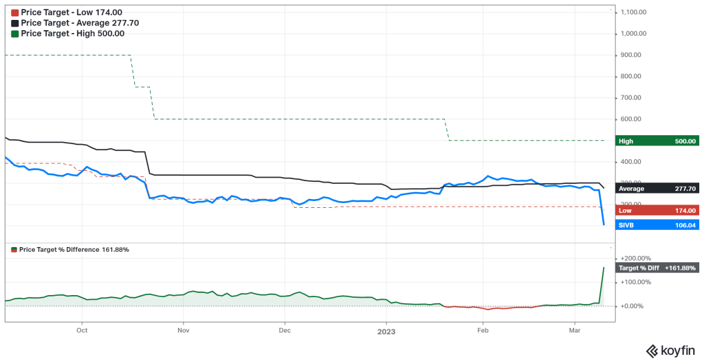 Let’s rewind a minute first. As of this morning the average price target for SIVB was 277.70, within a low-hi range of 174 and 500. Someone had a 500 price target on this stock.