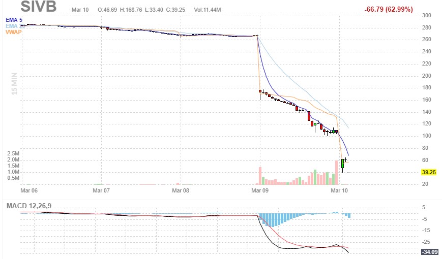 Not sure exactly at what point I noticed the daily chart for Silicon Valley Bank (SIVB), I guess it passed across the Bloomberg coverage minimized in the lower right hand of my screen. It had opened the day around 176 after closing Wednesday at 267.83. Another crypto blowup or something I thought.