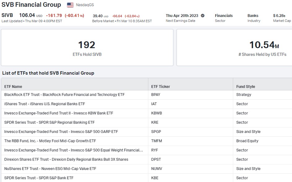 What about ETF exposure? 192 were invested for a total of 10.54M shares. I assume the 3x levered Regional Banks Bull symbol “DPST” is for “deposit”. After today it will look more like “dumpster”. This swoon should be temporary, as the majority of regionals are fine, but welcome to the risks of concentrated and triple levered exposure.