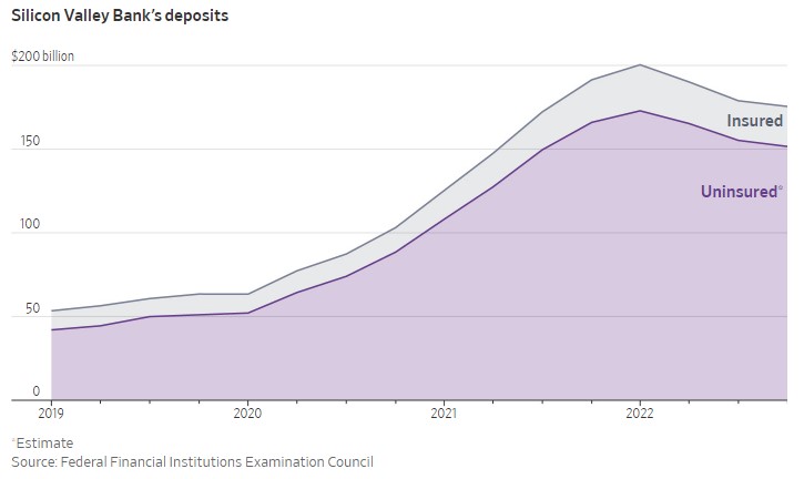 The majority of SVB deposits were uninsured. Hundreds of smaller VC backed start-ups and tech-focused companies in their early stages had used SVB for cash holdings well above and beyond the insured $250K.