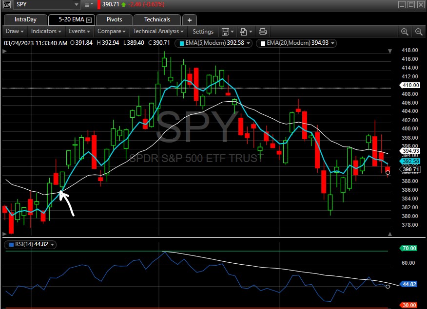 Post Fed this week, the SPY attempted a 5/20 EMA bullish crossover and failed. It would have been the first such event since January 10th. Instead, overhead resistance abounds, in the form of just about every major moving average one can name and relative strength (RSI) is decreasing.