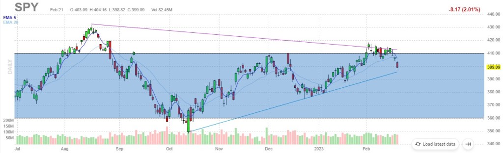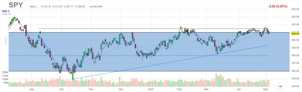 Finviz has updated the sideways range of SPY to 380-415, my range originally outlined in January (in blue) is 360-410. Take your pick. Fill in the blanks.