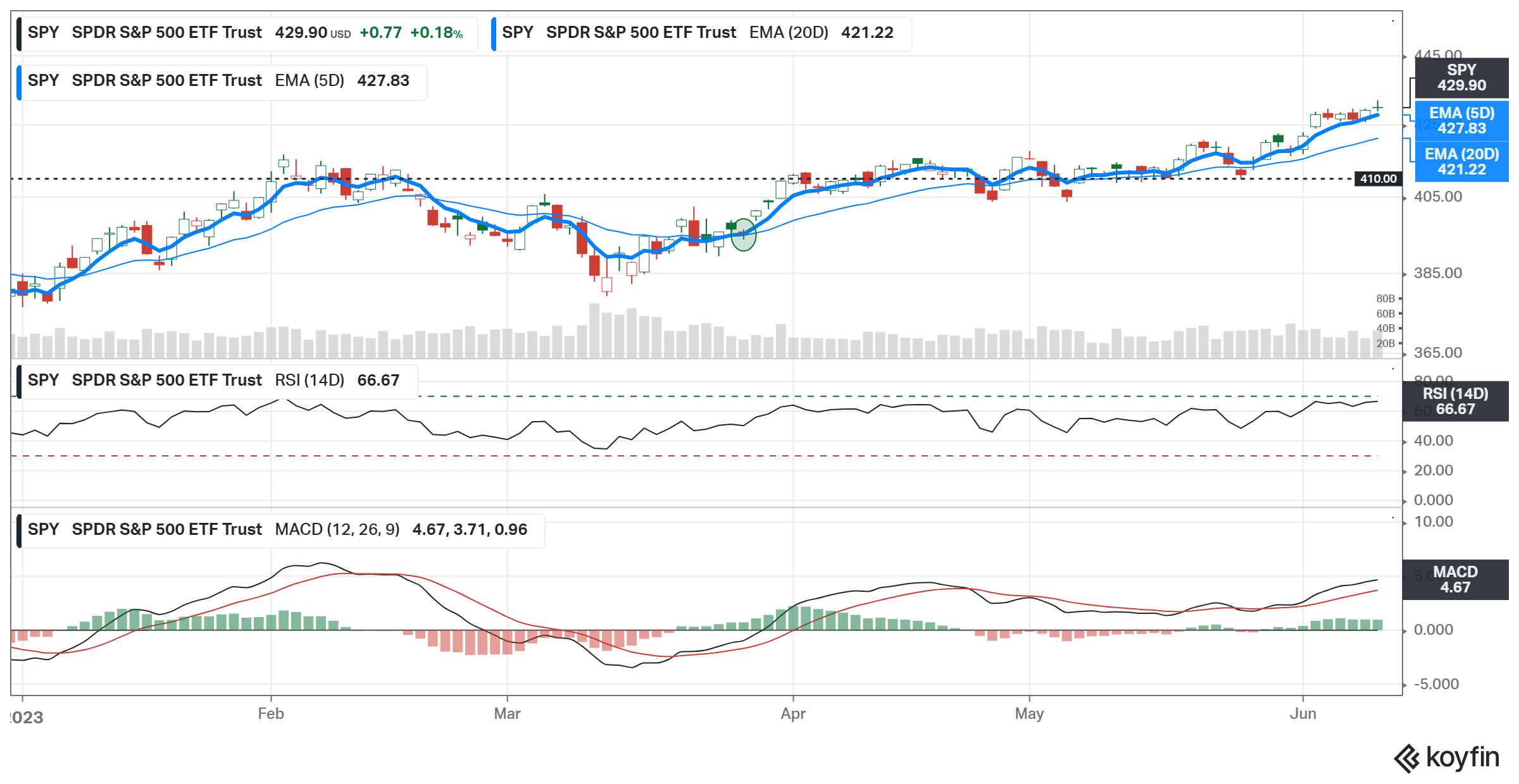 Never mind large cap tech, the RSI on SPY is sitting at 4 month highs with the buy signal generated back in late March still very much intact. My 410 level is long gone!
