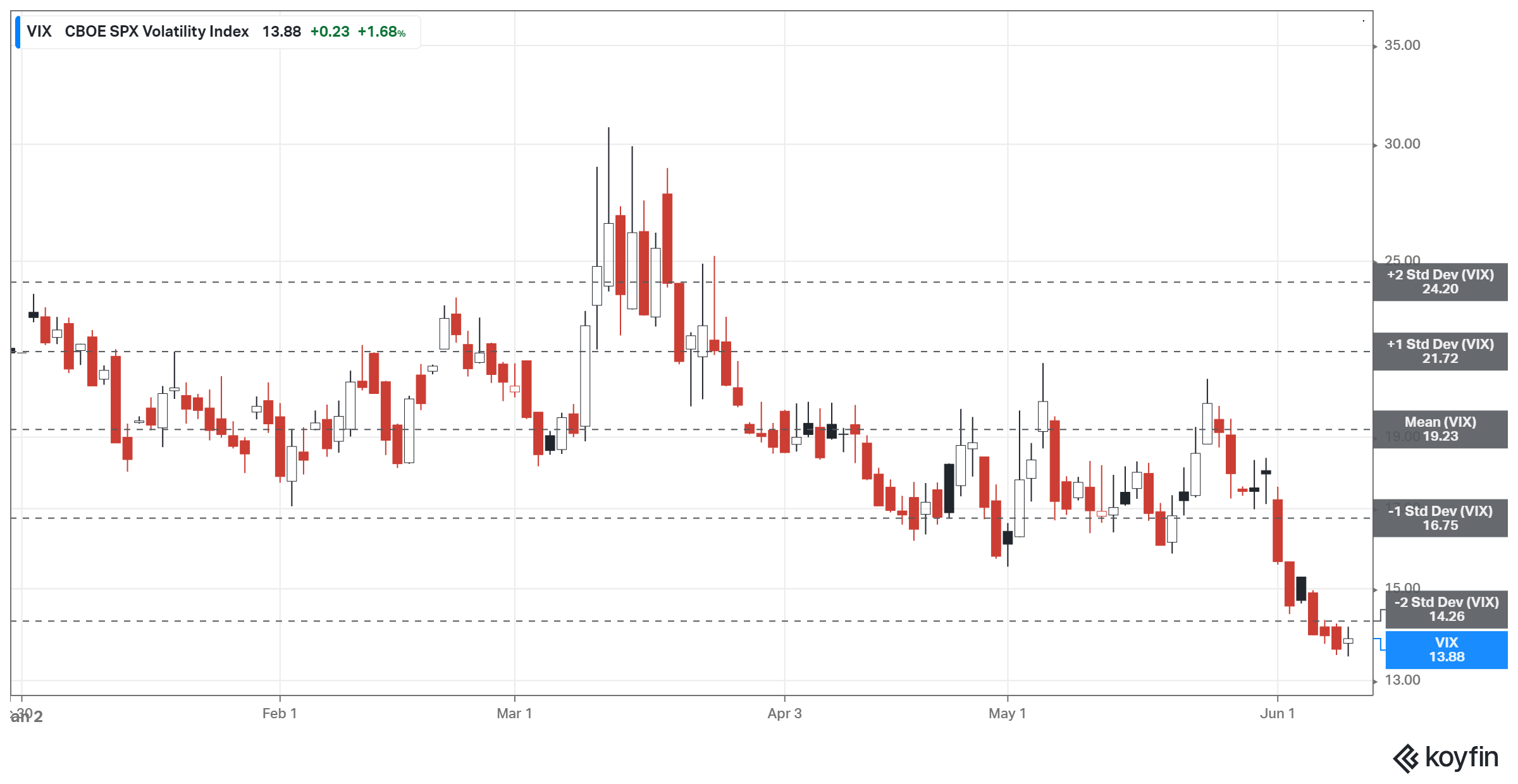 Sell in May and Go Away has taken on a whole new meaning this year, markets always tend to feel a bit sleepy in early Summer but this one feels more like a coma. I recall tracking the VIX at 20/28/36, 20 being the floor of complacency with the others being one and two standard deviations away.