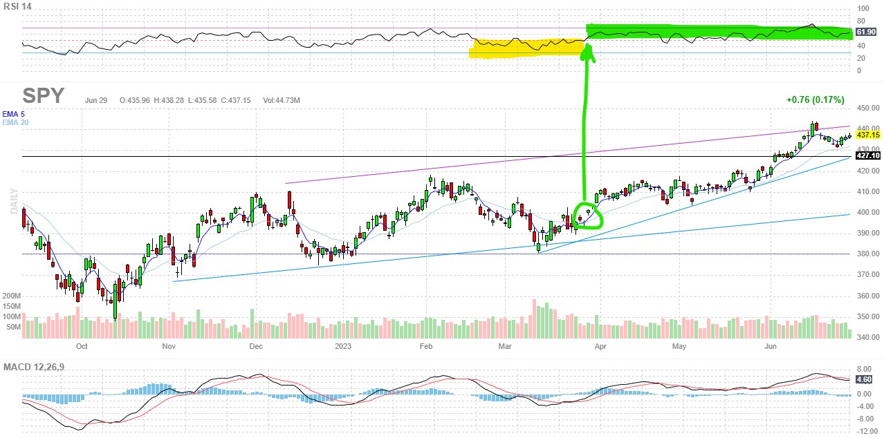 The blip due to the bank failures earlier this year was quickly erased and SPY soon re-entered a bull market having re-traced 20% from the October lows.