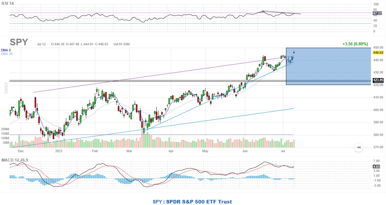 We gapped up today post CPI, held and closed above the rising channel. 450 is suddenly within reach. The bottom of this “zone” is 420, nothing scientific or special about that number, I chose it simply because it lies below an unfilled gap at 422 (the double line).
