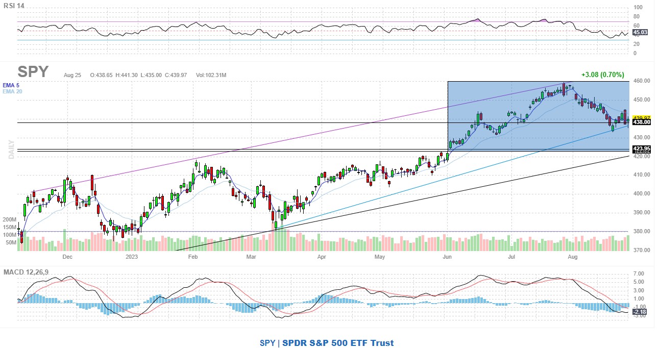 Same SPY chart with some subtle additions of my own: projected trading range, a revised channel, support line at 438 and the unfilled gap at 423.95: