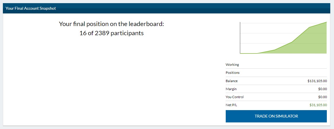 Thanks to the CME for this challenge and I look forward to the Equity futures challenge in late October. These challenges are a great way to hone your trading skills and ideas with zero risk.