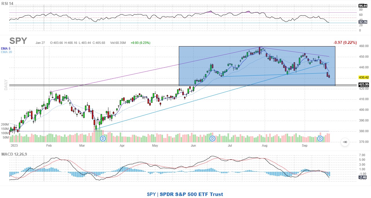 The tides have turned this week. The Fed stood down on rates as expected but we are having a little bit of post Fed hangover it would seem. We are still swimming in my previously outlined range between 460 and the unfilled gap at 423 but the uptrend has officially Audi 5’d: