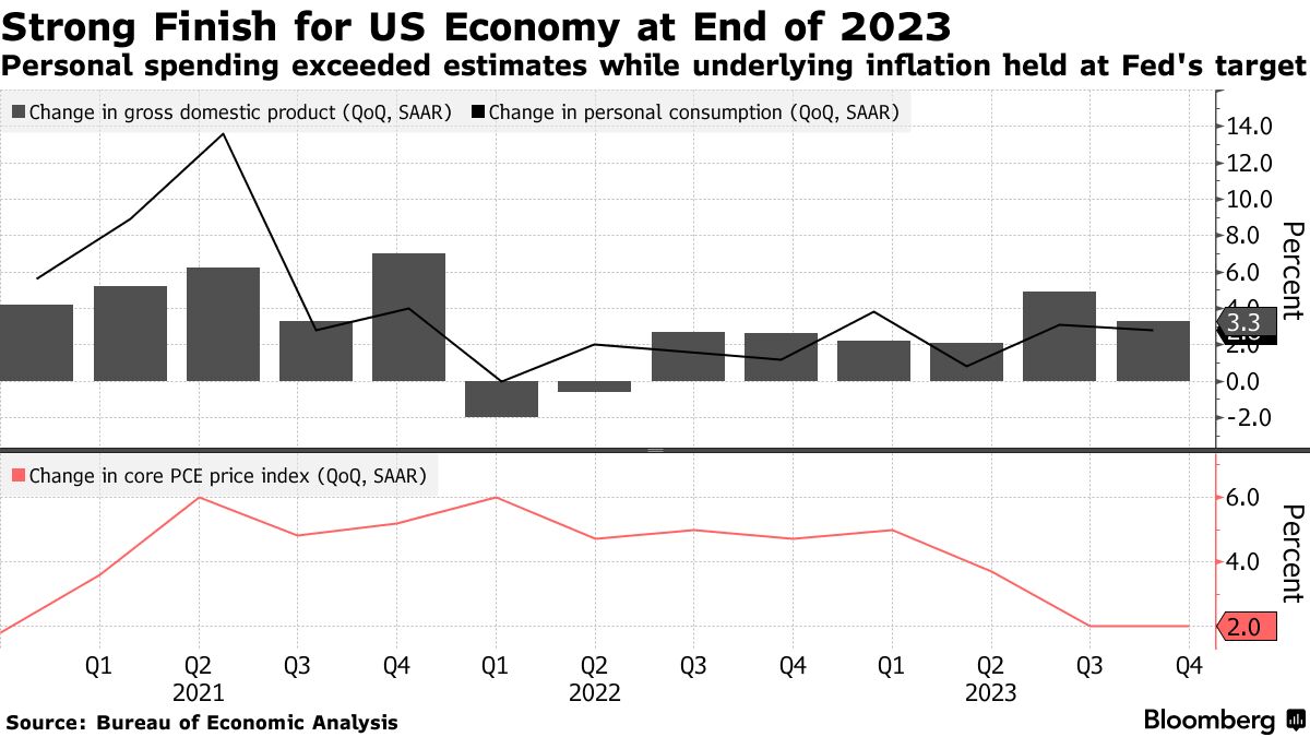 GDP for Q4 surprised to the upside at 3.3% indicating strength while the underlying core PCE the Fed watches closely remained pegged to their 2% target: