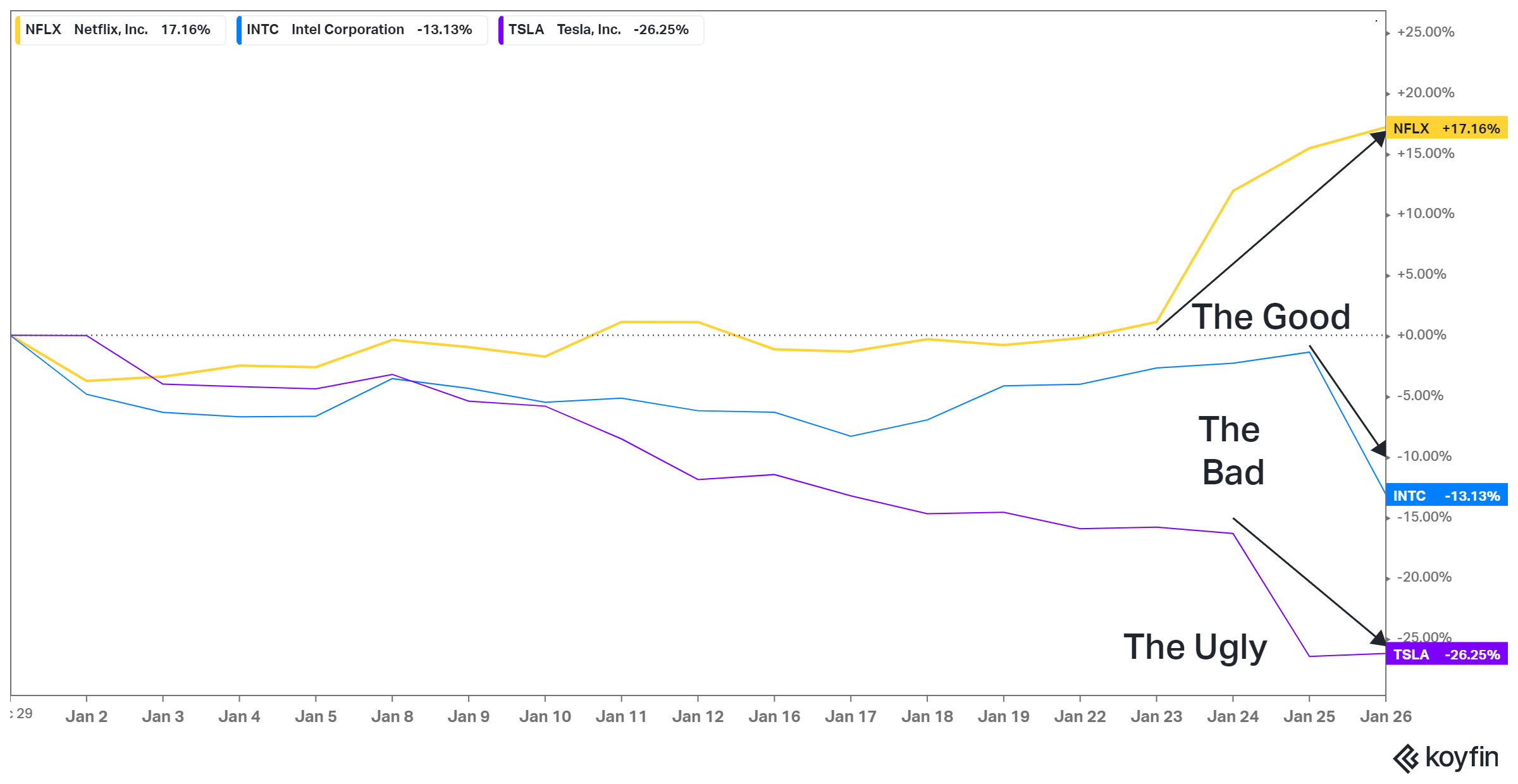 Big tech earnings kick off this upcoming week and should set the tone as we await the Fed meeting and presser on Wednesday 1/31. Earnings reactions are likely to be anything but muted if Netflix, Intel and Tesla were any indication: