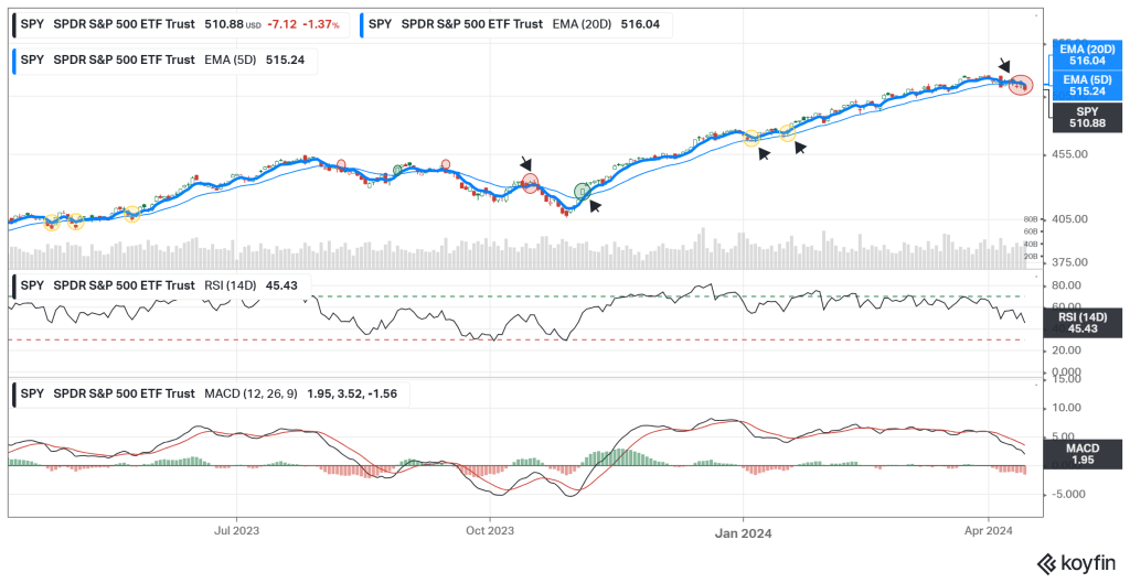 The RSI is below 50, weakening. The MACD is falling, faster. Not to say all of this could reverse on a dime Monday, but the signals are what the signals are. Time for a breather.