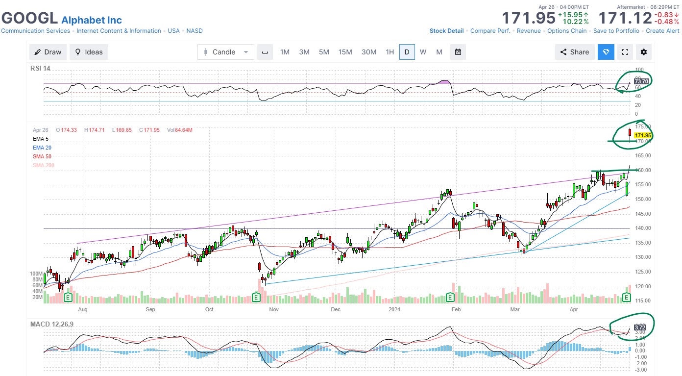 If Google’s move looks a bit extreme, it was, due to their announcement of a $0.20 dividend. Nobody had that on their bingo card. That little bonus combined with increased growth and of course AI hype lifted it well out of its range.
