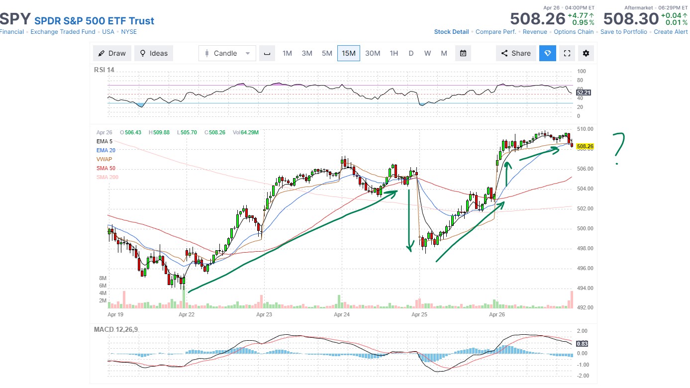 So to put the whipsaw week in perspective, here is a 15-min chart of the SPY: