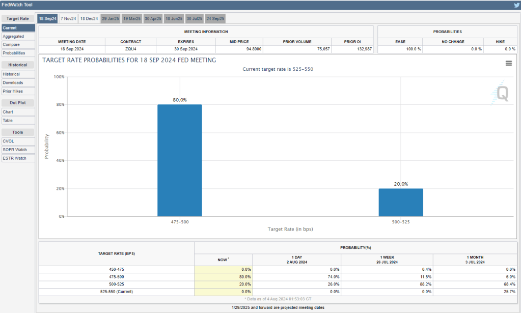 Case in point, broader index moves aside, the market is now predicting an 80% chance of a 50bps cut in September! So over the course of two trading days, the consensus went from “get started with 25″ to ” GET STARTED WITH 50″!