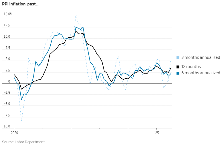 The cooler CPI and jobs data had spurred talk of a 50bps cut in September and was even being priced in. The PPI print put the kibosh on that, wholesale inflation turned north abruptly, no doubt tariff related: