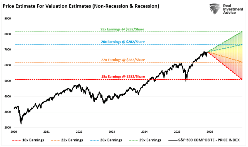 I really like this chart by RIA which adds in layers of projected multiples, whether we maintain the 26x or price in higher/lower expectations: